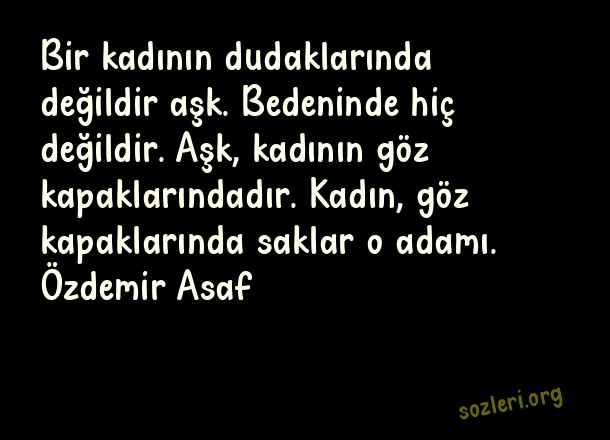 Bir kadının dudaklarında değildir aşk. Bedeninde hiç değildir. Aşk, kadının göz kapaklarındadır. Kadın, göz kapaklarında saklar o adamı. Özdemir Asaf ( Harika Aşk )