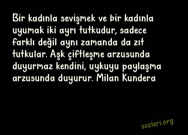 Bir kadınla sevişmek ve bir kadınla uyumak iki ayrı tutkudur, sadece farklı değil aynı zamanda da zıt tutkular. Aşk çiftleşme arzusunda duyurmaz kendini, uykuyu paylaşma arzusunda duyurur. Milan Kundera ( Yazarlardan Aşk )
