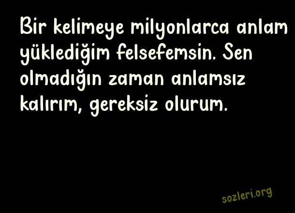 Bir kelimeye milyonlarca anlam yüklediğim felsefemsin. Sen olmadığın zaman anlamsız kalırım, gereksiz olurum. ( Aşk )
