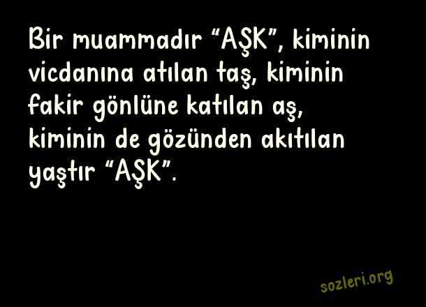 Bir muammadır “AŞK”, kiminin vicdanına atılan taş, kiminin fakir gönlüne katılan aş, kiminin de gözünden akıtılan yaştır “AŞK”. ( Aşka Dair Sözler )