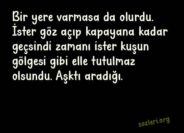 Bir yere varmasa da olurdu. İster göz açıp kapayana kadar geçsindi zamanı ister kuşun gölgesi gibi elle tutulmaz olsundu. Aşktı aradığı. ( Elif Şafak Aşk )