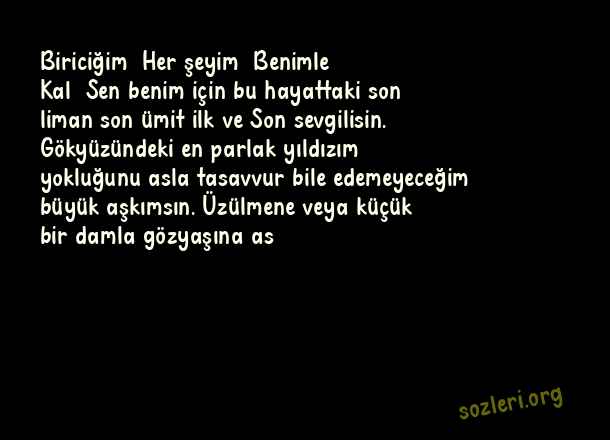 Biriciğim… Her şeyim… Benimle Kal… Sen benim için bu hayattaki son liman son ümit ilk ve Son sevgilisin. Gökyüzündeki en parlak yıldızım yokluğunu asla tasavvur bile edemeyeceğim büyük aşkımsın. Üzülmene veya küçük bir damla gözyaşına as ( Aşk Mektupları )