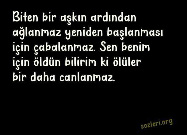 Biten bir aşkın ardından ağlanmaz yeniden başlanması için çabalanmaz. Sen benim için öldün bilirim ki ölüler bir daha canlanmaz. ( Başlamadan Biten Aşk )