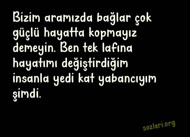 Bizim aramızda bağlar çok güçlü hayatta kopmayız demeyin. Ben tek lafına hayatımı değiştirdiğim insanla yedi kat yabancıyım şimdi. ( Bitmiş Aşk )