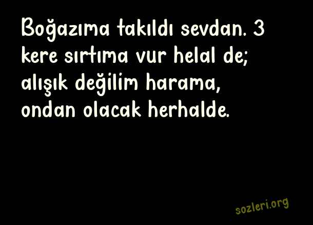 Boğazıma takıldı sevdan. 3 kere sırtıma vur helal de; alışık değilim harama, ondan olacak herhalde. ( Aşk Yazıları )