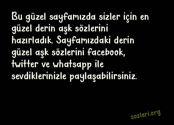 Bu güzel sayfamızda sizler için en güzel derin aşk sözlerini hazırladık. Sayfamızdaki derin güzel aşk sözlerini facebook, twitter ve whatsapp ile sevdiklerinizle paylaşabilirsiniz. ( Derin Aşk )