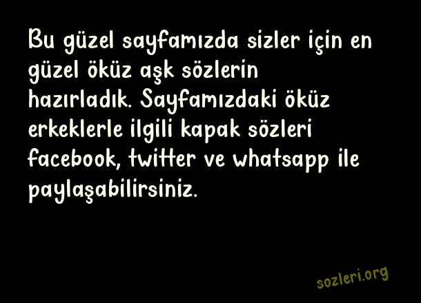 Bu güzel sayfamızda sizler için en güzel öküz aşk sözlerin hazırladık. Sayfamızdaki öküz erkeklerle ilgili kapak sözleri facebook, twitter ve whatsapp ile paylaşabilirsiniz. ( Öküz Aşk )