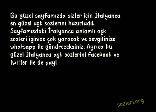 Bu güzel sayfamızda sizler için İtalyanca en güzel aşk sözlerini hazırladık. Sayfamızdaki İtalyanca anlamlı aşk sözleri işinize çok yaracak ve sevgilinize whatsapp ile göndreceksiniz. Ayrıca bu güzel İtalyanca aşk sözlerini facebook ve twitter ile de payl ( İtalyanca Aşk )
