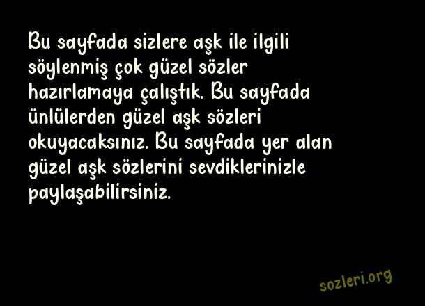 Bu sayfada sizlere aşk ile ilgili söylenmiş çok güzel sözler hazırlamaya çalıştık. Bu sayfada ünlülerden güzel aşk sözleri okuyacaksınız. Bu sayfada yer alan güzel aşk sözlerini sevdiklerinizle paylaşabilirsiniz. ( Aşk İle İlgili Güzel Sözler )