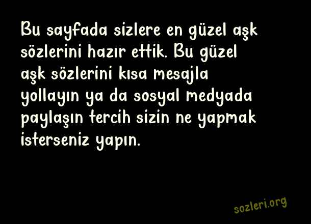 Bu sayfada sizlere en güzel aşk sözlerini hazır ettik. Bu güzel aşk sözlerini kısa mesajla yollayın ya da sosyal medyada paylaşın tercih sizin ne yapmak isterseniz yapın. ( En Güzel Aşk )