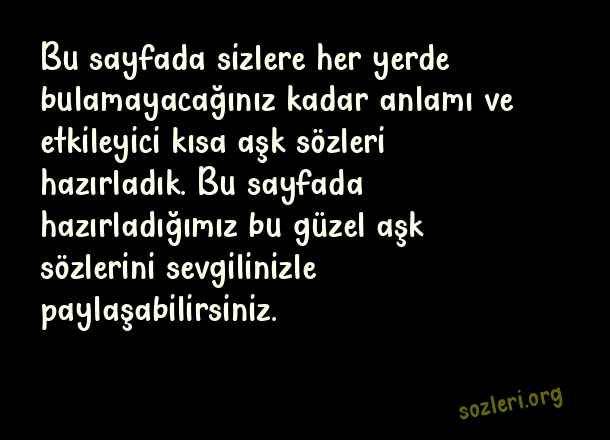 Bu sayfada sizlere her yerde bulamayacağınız kadar anlamı ve etkileyici kısa aşk sözleri hazırladık. Bu sayfada hazırladığımız bu güzel aşk sözlerini sevgilinizle paylaşabilirsiniz. ( Aşk Kısa Anlamlı Etkileyici )