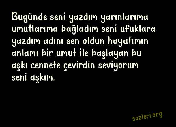 Bugünde seni yazdım yarınlarıma umutlarıma bağladım seni ufuklara yazdım adını sen oldun hayatımın anlamı bir umut ile başlayan bu aşkı cennete çevirdin seviyorum seni aşkım. ( Sevgiliye Aşk )