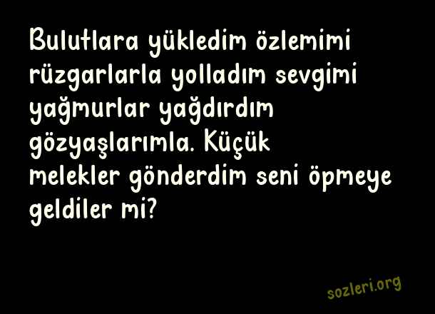 Bulutlara yükledim özlemimi rüzgarlarla yolladım sevgimi yağmurlar yağdırdım gözyaşlarımla. Küçük melekler gönderdim seni öpmeye geldiler mi? ( Aşk Dolu Mesajlar )