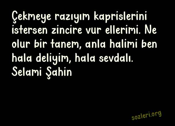 Çekmeye razıyım kaprislerini istersen zincire vur ellerimi. Ne olur bir tanem, anla halimi ben hala deliyim, hala sevdalı. Selami Şahin ( 2023 Aşk )