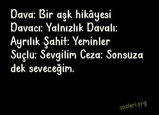 Dava: Bir aşk hikâyesi Davacı: Yalnızlık Davalı: Ayrılık Şahit: Yeminler Suçlu: Sevgilim Ceza: Sonsuza dek seveceğim. ( Garip Aşk )