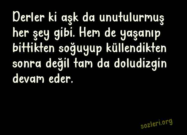 Derler ki aşk da unutulurmuş her şey gibi. Hem de yaşanıp bittikten soğuyup küllendikten sonra değil tam da doludizgin devam eder. ( Elif Şafak Aşk )