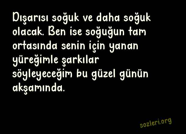 Dışarısı soğuk ve daha soğuk olacak. Ben ise soğuğun tam ortasında senin için yanan yüreğimle şarkılar söyleyeceğim bu güzel günün akşamında. ( Aşk Sayfası )