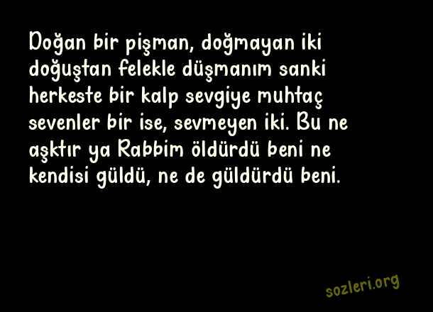 Doğan bir pişman, doğmayan iki doğuştan felekle düşmanım sanki herkeste bir kalp sevgiye muhtaç sevenler bir ise, sevmeyen iki. Bu ne aşktır ya Rabbim öldürdü beni ne kendisi güldü, ne de güldürdü beni. ( Arabesk Aşk )