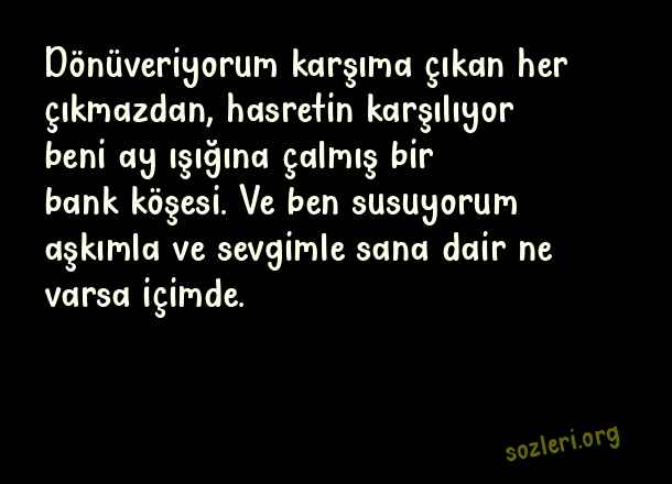 Dönüveriyorum karşıma çıkan her çıkmazdan, hasretin karşılıyor beni ay ışığına çalmış bir bank köşesi. Ve ben susuyorum aşkımla ve sevgimle sana dair ne varsa içimde. ( Aşk Sayfası )