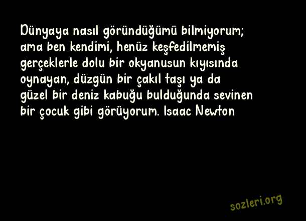 Dünyaya nasıl göründüğümü bilmiyorum; ama ben kendimi, henüz keşfedilmemiş gerçeklerle dolu bir okyanusun kıyısında oynayan, düzgün bir çakıl taşı ya da güzel bir deniz kabuğu bulduğunda sevinen bir çocuk gibi görüyorum. lsaac Newton ( Yazarlardan Aşk )