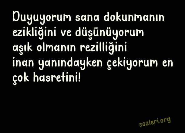 Duyuyorum sana dokunmanın ezikliğini ve düşünüyorum aşık olmanın rezilliğini inan yanındayken çekiyorum en çok hasretini! ( Etkileyici Aşk )