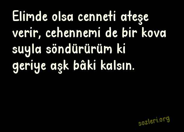 Elimde olsa cenneti ateşe verir, cehennemi de bir kova suyla söndürürüm ki geriye aşk bâki kalsın. ( Elif Şafak Aşk )