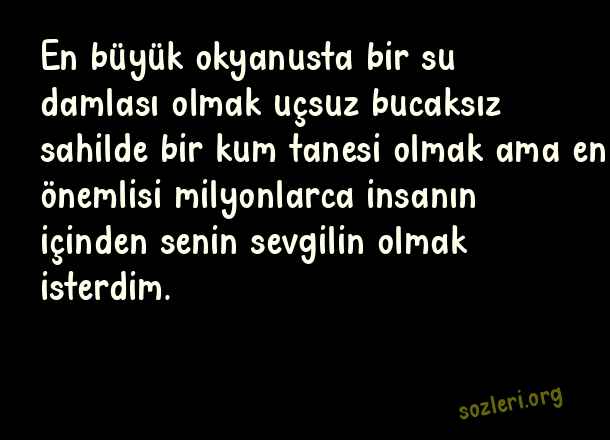 En büyük okyanusta bir su damlası olmak uçsuz bucaksız sahilde bir kum tanesi olmak ama en önemlisi milyonlarca insanın içinden senin sevgilin olmak isterdim. ( Kalbe Dokunan Aşk )
