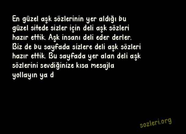 En güzel aşk sözlerinin yer aldığı bu güzel sitede sizler için deli aşk sözleri hazır ettik. Aşk insanı deli eder derler. Biz de bu sayfada sizlere deli aşk sözleri hazır ettik. Bu sayfada yer alan deli aşk sözlerini sevdiğinize kısa mesajla yollayın ya d ( Deli Aşk )