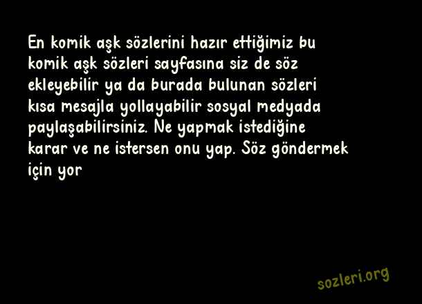 En komik aşk sözlerini hazır ettiğimiz bu komik aşk sözleri sayfasına siz de söz ekleyebilir ya da burada bulunan sözleri kısa mesajla yollayabilir sosyal medyada paylaşabilirsiniz. Ne yapmak istediğine karar ve ne istersen onu yap. Söz göndermek için yor ( Komik Aşk )