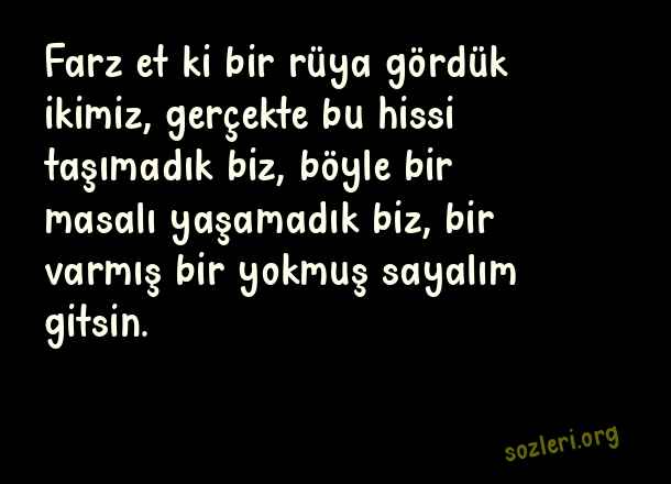 Farz et ki bir rüya gördük ikimiz, gerçekte bu hissi taşımadık biz, böyle bir masalı yaşamadık biz, bir varmış bir yokmuş sayalım gitsin. ( Arabesk Aşk )
