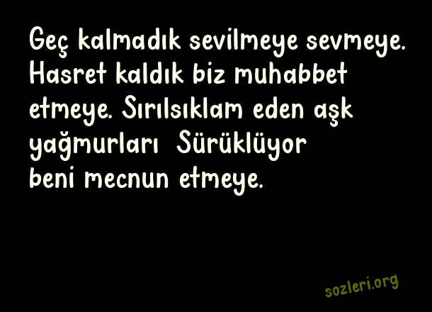 Geç kalmadık sevilmeye sevmeye. Hasret kaldık biz muhabbet etmeye. Sırılsıklam eden aşk yağmurları… Sürüklüyor beni mecnun etmeye. ( Arabesk Aşk )
