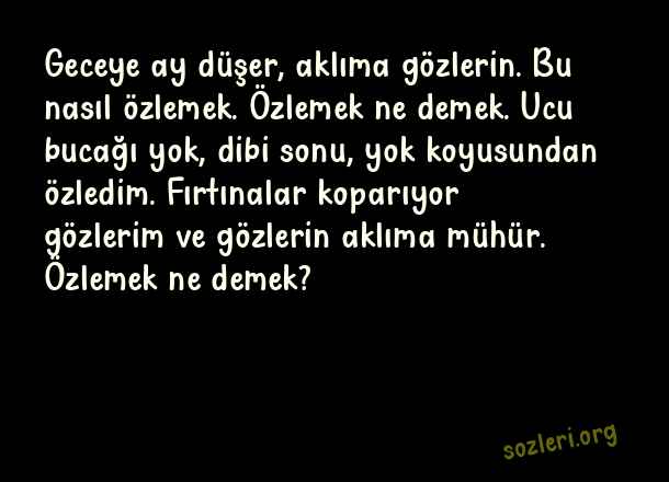 Geceye ay düşer, aklıma gözlerin. Bu nasıl özlemek. Özlemek ne demek. Ucu bucağı yok, dibi sonu, yok koyusundan özledim. Fırtınalar koparıyor gözlerim ve gözlerin aklıma mühür. Özlemek ne demek? ( Aşk )