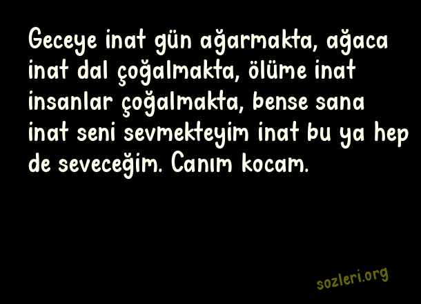 Geceye inat gün ağarmakta, ağaca inat dal çoğalmakta, ölüme inat insanlar çoğalmakta, bense sana inat seni sevmekteyim inat bu ya hep de seveceğim. Canım kocam. ( Kocaya Aşk )