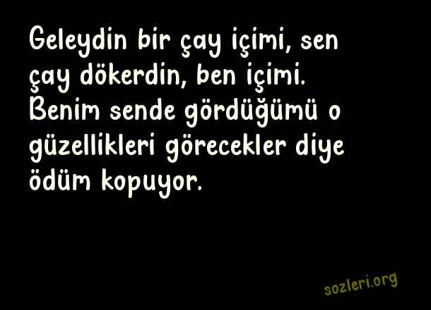 Geleydin bir çay içimi, sen çay dökerdin, ben içimi. Benim sende gördüğümü o güzellikleri görecekler diye ödüm kopuyor. ( Anonim Aşk )