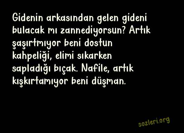 Gidenin arkasından gelen gideni bulacak mı zannediyorsun? Artık şaşırtmıyor beni dostun kahpeliği, elimi sıkarken sapladığı bıçak. Nafile, artık kışkırtamıyor beni düşman. ( En Güzel Aşk Dolu Sözler 2023 )
