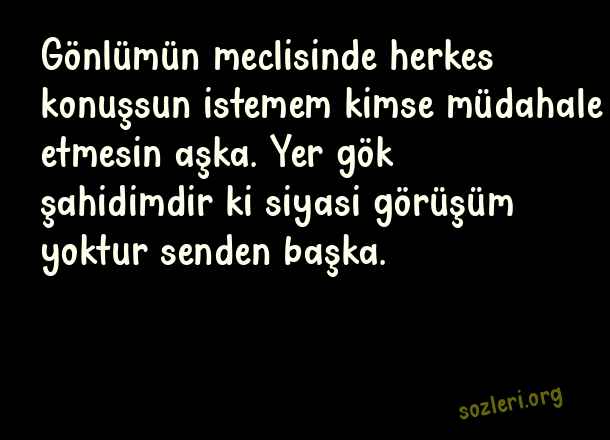 Gönlümün meclisinde herkes konuşsun istemem kimse müdahale etmesin aşka. Yer gök şahidimdir ki siyasi görüşüm yoktur senden başka. ( Aşkıma Güzel Sözler )