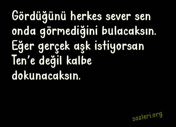 Gördüğünü herkes sever sen onda görmediğini bulacaksın. Eğer gerçek aşk istiyorsan Ten’e değil kalbe dokunacaksın. ( Dayanılmaz Aşk )