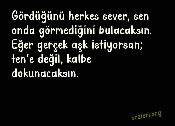 Gördüğünü herkes sever, sen onda görmediğini bulacaksın. Eğer gerçek aşk istiyorsan; ten’e değil, kalbe dokunacaksın. ( Sevgiliye Söylenecek En Güzel Aşk )