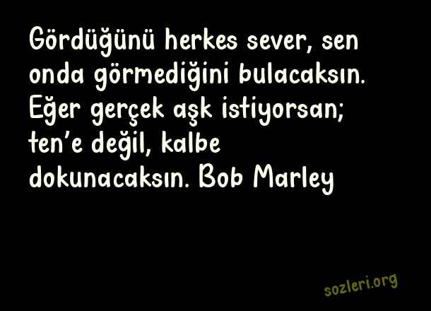 Gördüğünü herkes sever, sen onda görmediğini bulacaksın. Eğer gerçek aşk istiyorsan; ten’e değil, kalbe dokunacaksın. Bob Marley ( En İyi 50 Aşk Sözü )