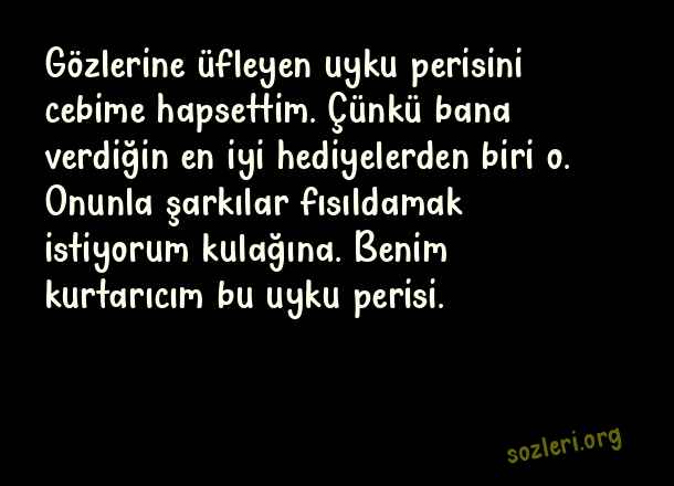 Gözlerine üfleyen uyku perisini cebime hapsettim. Çünkü bana verdiğin en iyi hediyelerden biri o. Onunla şarkılar fısıldamak istiyorum kulağına. Benim kurtarıcım bu uyku perisi. ( Sevgiliye Söylenecek En Güzel Aşk )