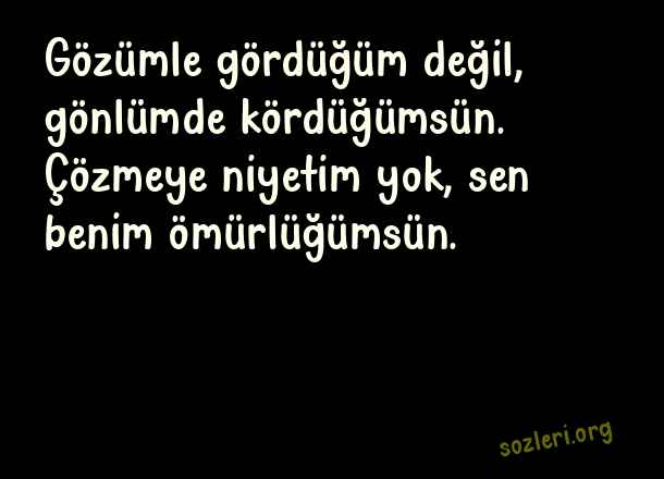 Gözümle gördüğüm değil, gönlümde kördüğümsün. Çözmeye niyetim yok, sen benim ömürlüğümsün. ( Aşk Konulu Sözler )