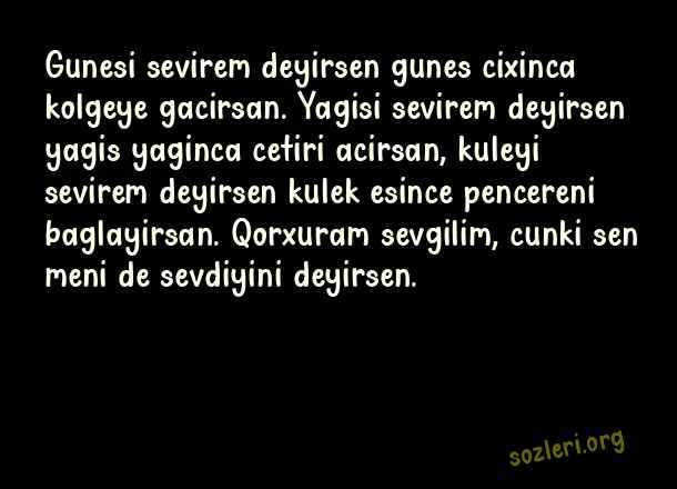 Gunesi sevirem deyirsen gunes cixinca kolgeye gacirsan. Yagisi sevirem deyirsen yagis yaginca cetiri acirsan, kuleyi sevirem deyirsen kulek esince pencereni baglayirsan. Qorxuram sevgilim, cunki sen meni de sevdiyini deyirsen. ( Azerice Aşk )