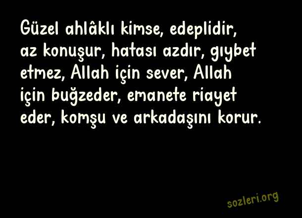 Güzel ahlâklı kimse, edeplidir, az konuşur, hatası azdır, gıybet etmez, Allah için sever, Allah için buğzeder, emanete riayet eder, komşu ve arkadaşını korur. ( Allah Aşkı )