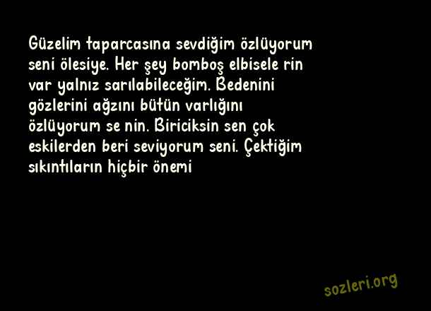 Güzelim taparcasına sevdiğim özlüyorum seni ölesiye. Her şey bomboş elbiselerin var yalnız sarılabileceğim. Bedenini gözlerini ağzını bütün varlığını özlüyorum senin. Biriciksin sen çok eskilerden beri seviyorum seni. Çektiğim sıkıntıların hiçbir önemi ( Aşk Mektupları )