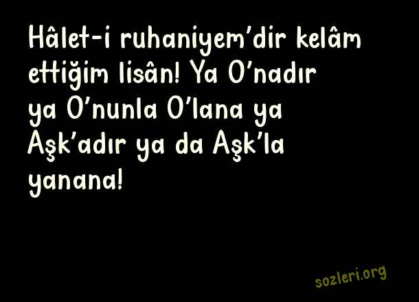 Hâlet-i ruhaniyem’dir kelâm ettiğim lisân! Ya O’nadır ya O’nunla O’lana ya Aşk’adır ya da Aşk’la yanana! ( Aşkıma Güzel Sözler )