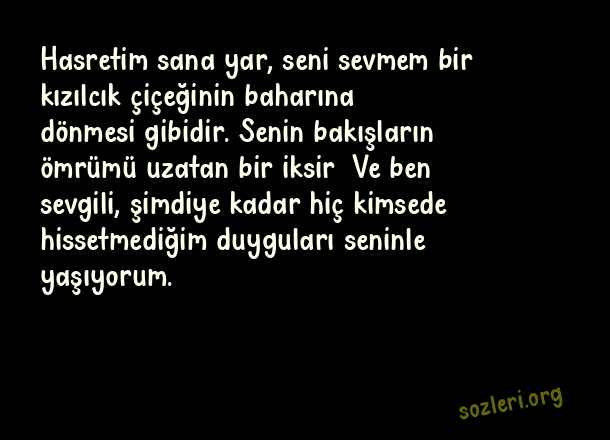 Hasretim sana yar, seni sevmem bir kızılcık çiçeğinin baharına dönmesi gibidir. Senin bakışların ömrümü uzatan bir iksir… Ve ben sevgili, şimdiye kadar hiç kimsede hissetmediğim duyguları seninle yaşıyorum. ( Aşk Sayfası )