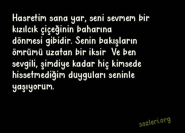 Hasretim sana yar, seni sevmem bir kızılcık çiçeğinin baharına dönmesi gibidir. Senin bakışların ömrümü uzatan bir iksir… Ve ben sevgili, şimdiye kadar hiç kimsede hissetmediğim duyguları seninle yaşıyorum. ( Uzun Aşk )