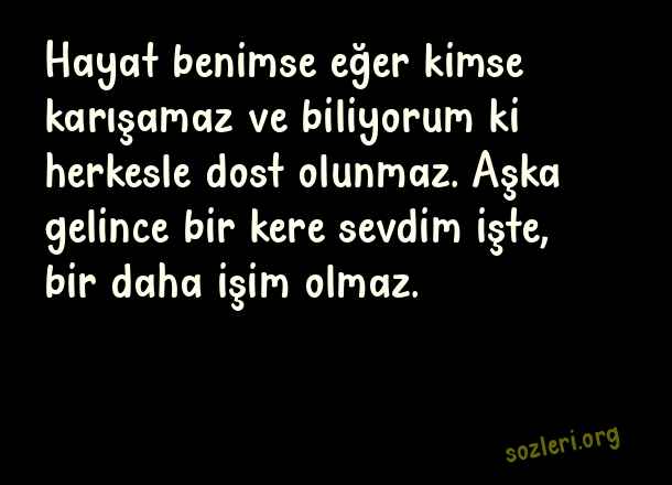 Hayat benimse eğer kimse karışamaz ve biliyorum ki herkesle dost olunmaz. Aşka gelince bir kere sevdim işte, bir daha işim olmaz. ( Aşka Dair Sözler )