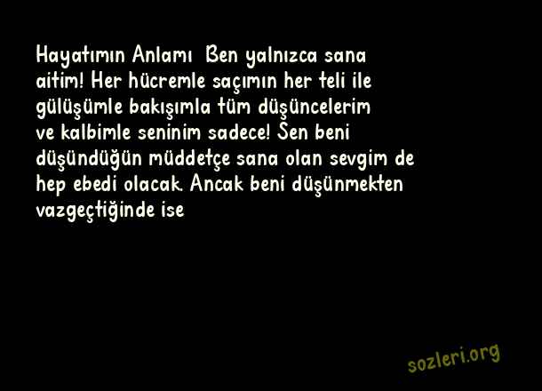 Hayatımın Anlamı… Ben yalnızca sana aitim! Her hücremle saçımın her teli ile gülüşümle bakışımla tüm düşüncelerim ve kalbimle seninim sadece! Sen beni düşündüğün müddetçe sana olan sevgim de hep ebedi olacak. Ancak beni düşünmekten vazgeçtiğinde ise ( Aşk Mektupları )