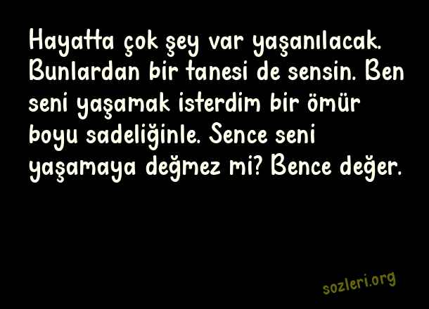 Hayatta çok şey var yaşanılacak. Bunlardan bir tanesi de sensin. Ben seni yaşamak isterdim bir ömür boyu sadeliğinle. Sence seni yaşamaya değmez mi? Bence değer. ( Platonik Aşk )